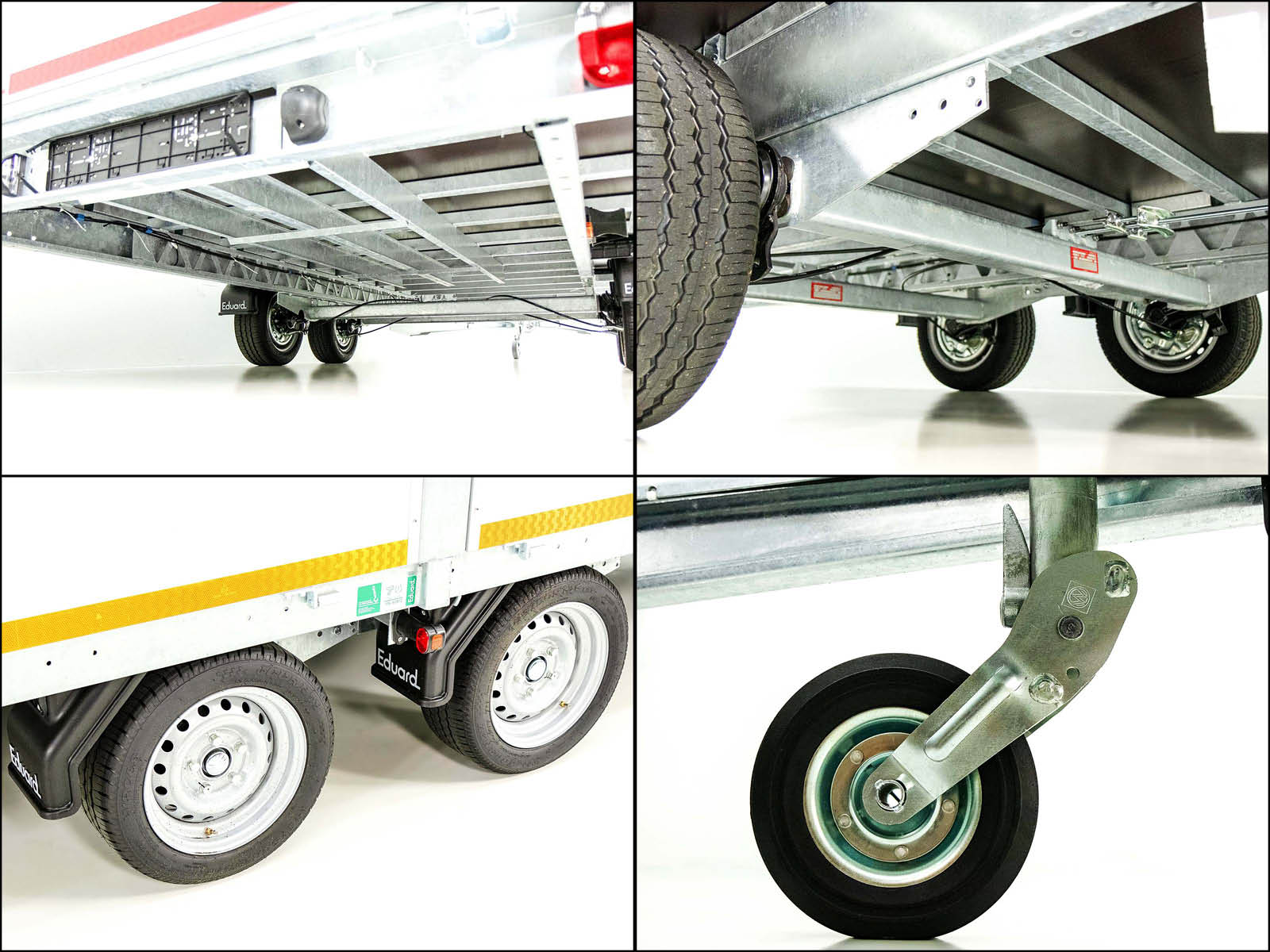 Der Eduard Hochlader Anhänger 4520 GD bietet mit einem Laderaum von 200×456 cm und einem zulässigen Gesamtgewicht von 3,0t eine hohe Nutzlast von ca. 2381 kg. Der Anhänger verfügt über einen feuerverzinkten Stahlrahmen und abnehmbare Bordwände aus Aluminium (300 mm hoch). Die Verzurrösen im Bodenrahmenprofil mit einer Belastbarkeit von 800 daN sorgen für eine sichere Ladungssicherung.