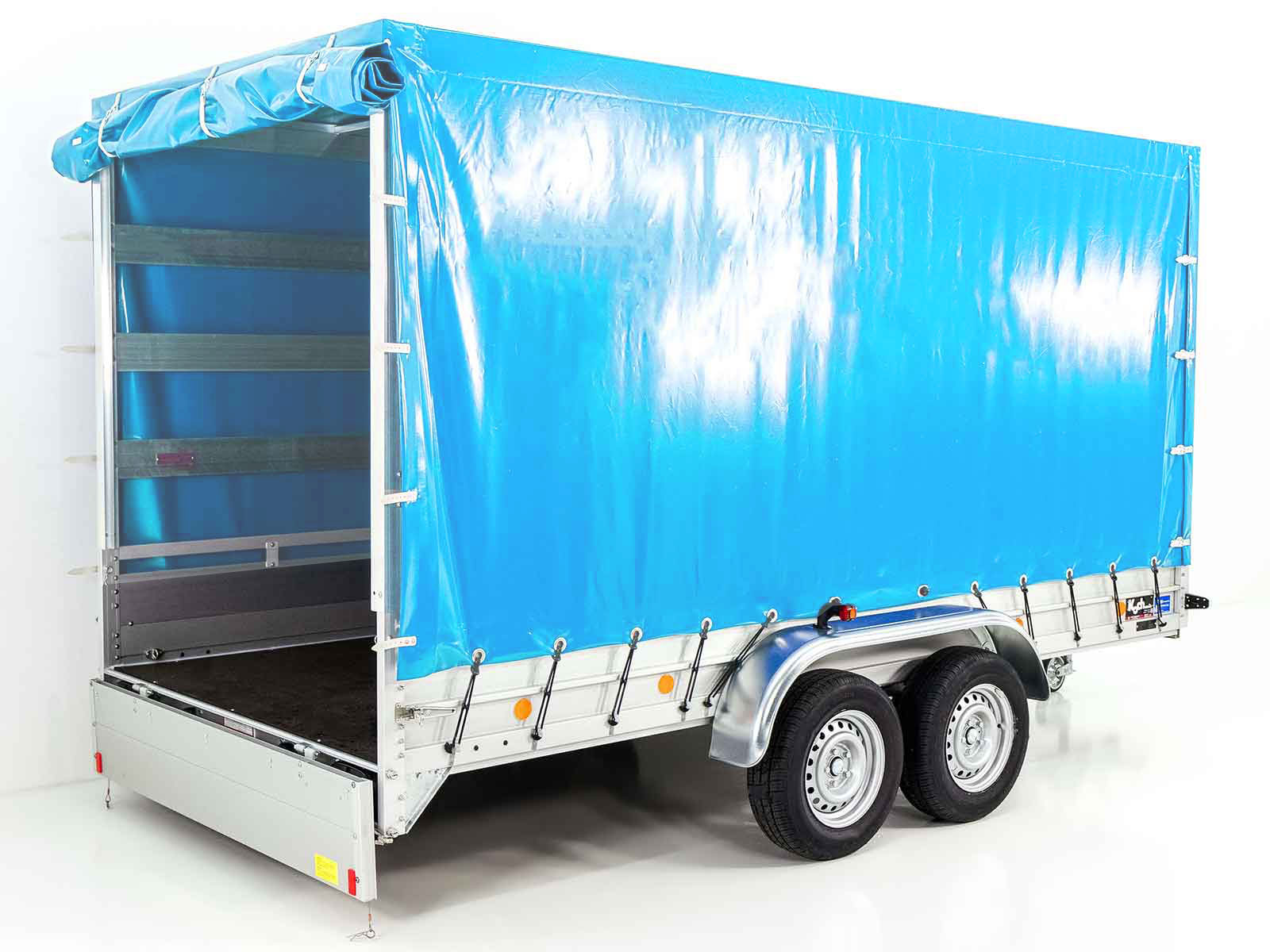 Der Koch Anhänger Typ 10.26 mit Hochplane 200 cm in Hellblau bietet eine erstklassige Bauweise mit einer hohen Nutzlast von 2090 kg und einem Gesamtgewicht von 2600 kg. Der Anhänger ist aus leichtem Aluminium gefertigt und überzeugt durch: