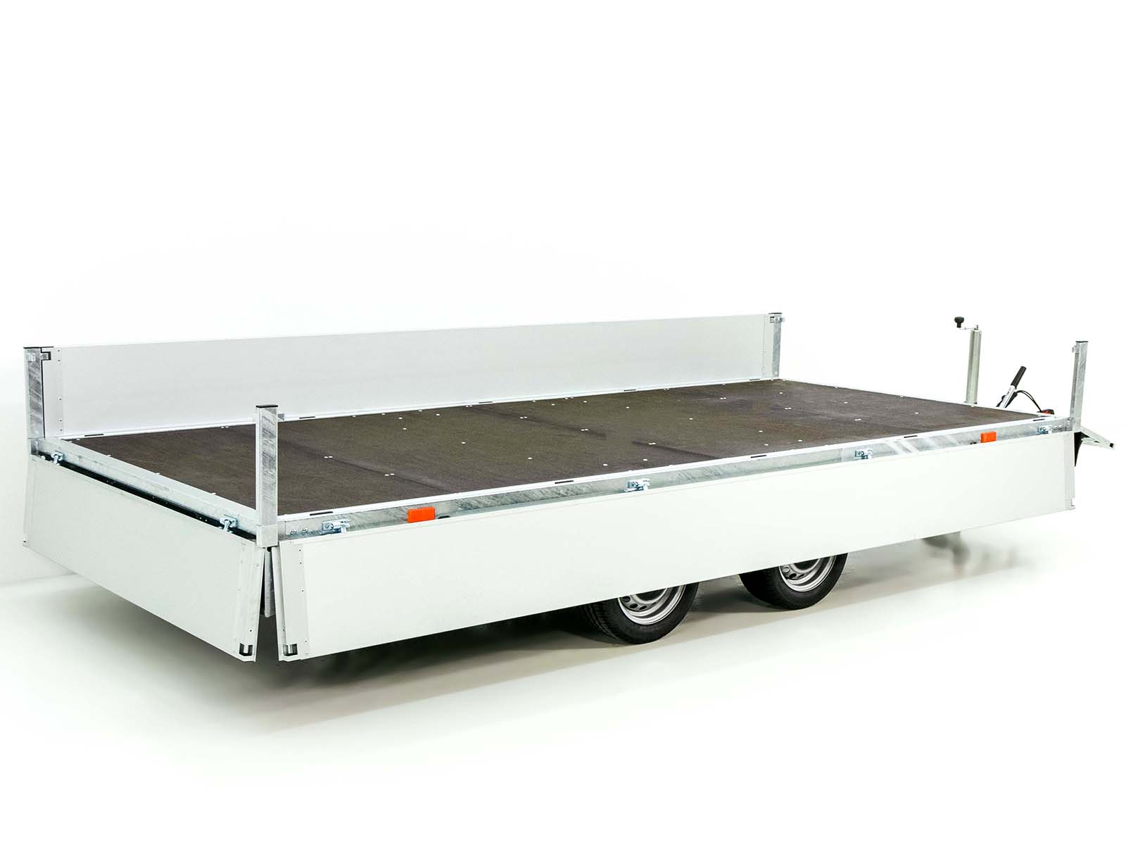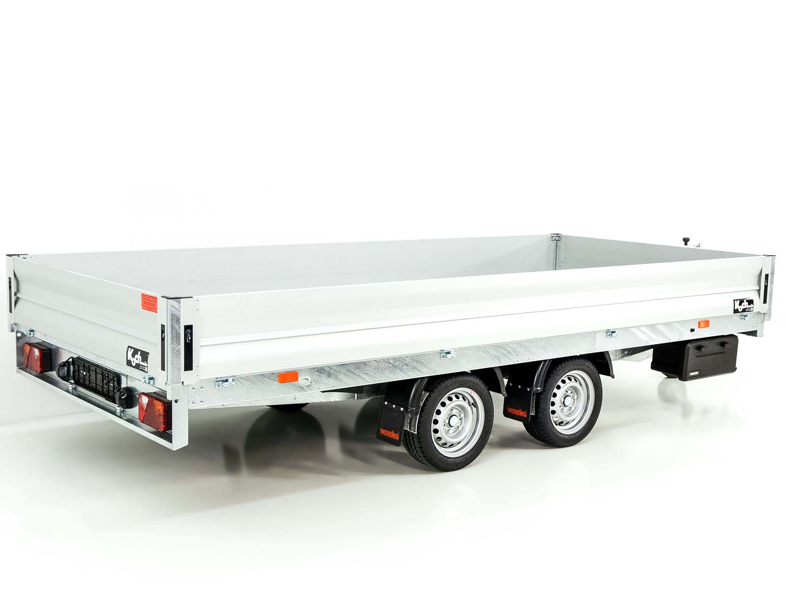 Der Vezeko Hochlader Anhänger D27.4 bietet eine noch größere Ladefläche von 182 x 417 cm und bleibt bei einem zulässigen Gesamtgewicht von 2,7 Tonnen. Mit einem Leergewicht von 563 kg und einer Nutzlast von 2137 kg bietet er großzügigen Platz für den Transport größerer Lasten. Wie der D27.3, ist dieser Anhänger mit Multiplex-Holzboden, abnehmbaren Aluminium-Bordwänden und 6 Zurrbügeln zur sicheren Ladungssicherung ausgestattet. Eine Stützenvorbereitung ermöglicht die Nachrüstung von Stützen. Der Anhänger ist auch für eine 100 km/h Zulassung geeignet. Zusätzlich bietet dieser Anhänger ein robustes Fahrwerk mit einer Gummifederachse und ein Automatik-Stützrad für einfachen Gebrauch und gute Handhabung.