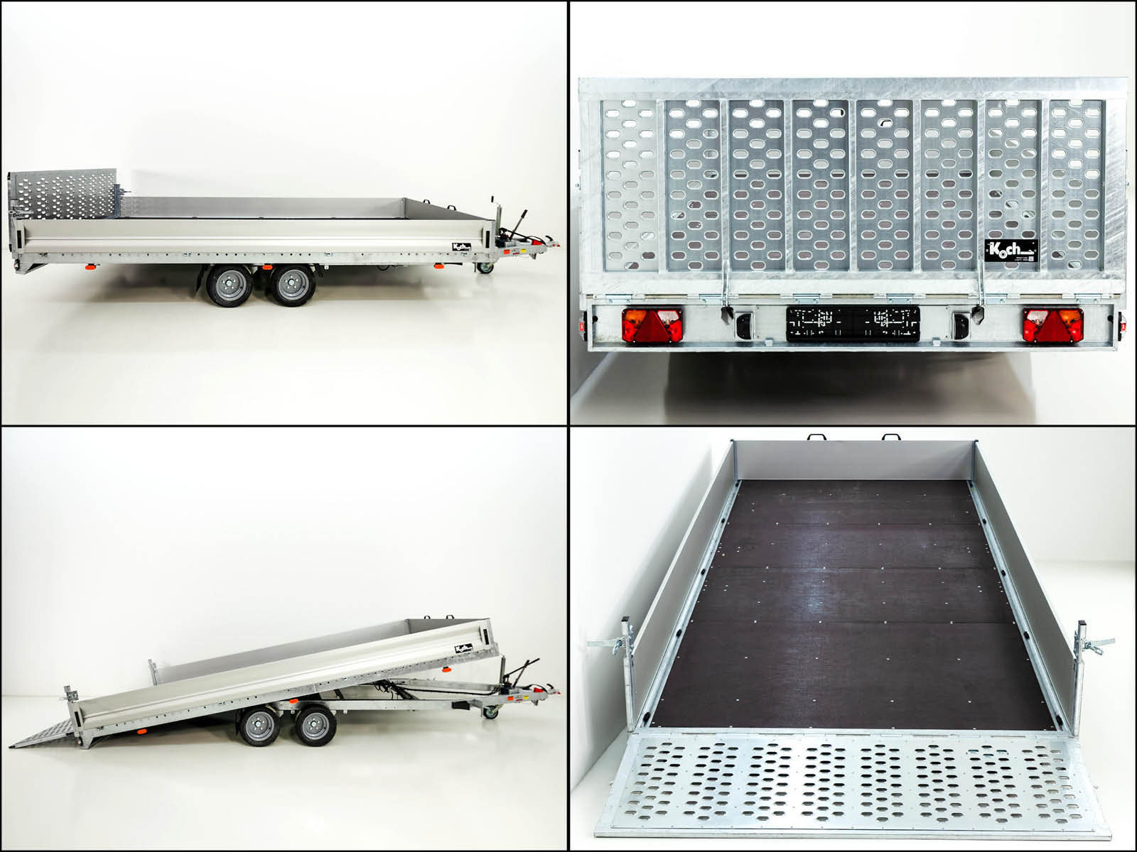 Der Vezeko Hochlader Anhänger J30.43 bietet eine robuste, kippbare Ladefläche und ist ideal für Transportaufgaben bis zu 3t Gesamtgewicht. Die Ladefläche kann mit einer einfachen manuellen Pumpe auf ca. 13,5° geneigt werden, was das Abladen vereinfacht. Er ist mit einer praktischen Auffahrrampe ausgestattet und bietet eine hohe Nutzlast von bis zu 2.195 kg, abhängig von der Ausstattung.
